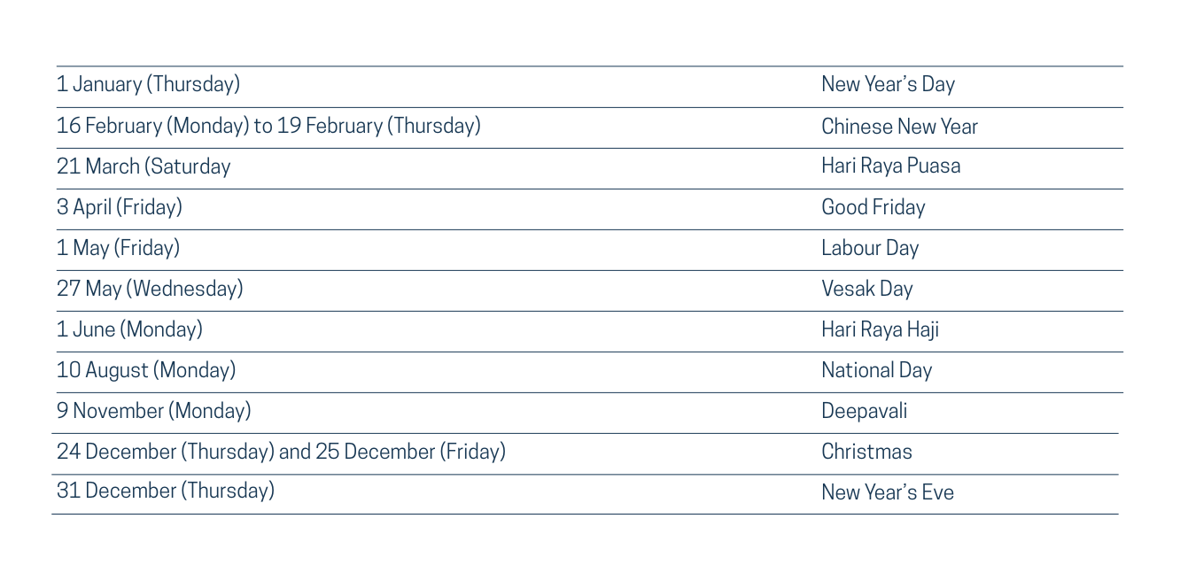• Lessons falling on Public Holidays or School Closure Dates will not be conducted or billed, and no replacement lessons will be required.